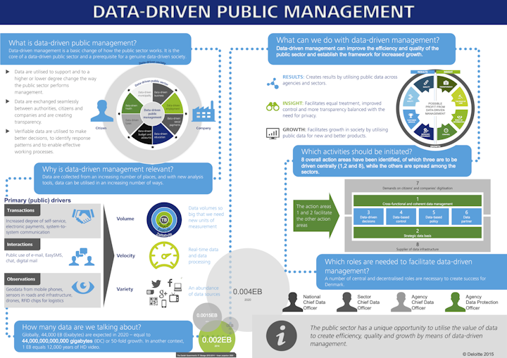 Developed a preliminary strategy that set the direction for how the Danish government will respond to the increasing volume, variety and velocity of data available to the Danish public sector. It resulted in a vision, strategic principles and governance suggestions. The results were summed up in a simple infographic.
